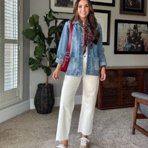 When you’re heading out for date night, it’s a perfect chance to wear your white jeans if you’re afraid to wear them around the kids. These jeans are so comfortable (they’re from Spanx and are pull on with a fake fly and tummy control), and they feel so summery paired with a light and airy floral top.