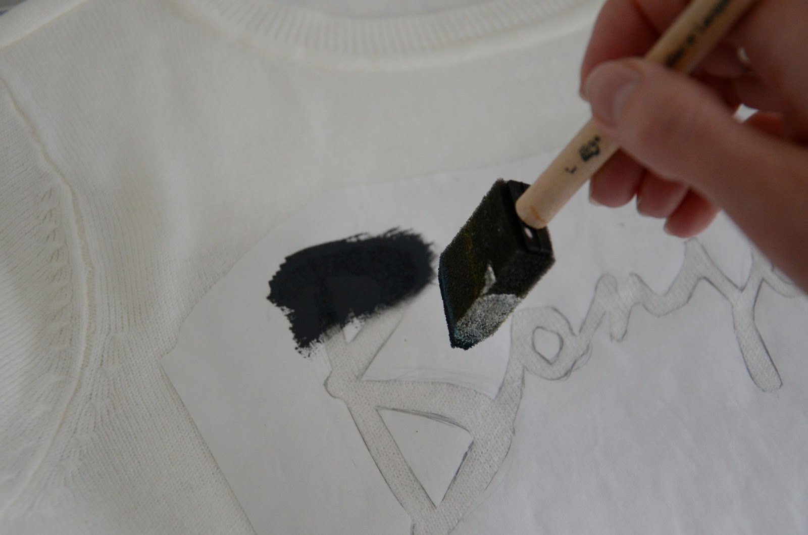 With a super plain sweater I bought a few months ago from Forever 21, and a freezer paper stencil, I pumped this baby out with only moments left on my one-hour clock. To be fair, drawing and cutting out the letters took the majority of my time — the actual painting took one minute at the most.