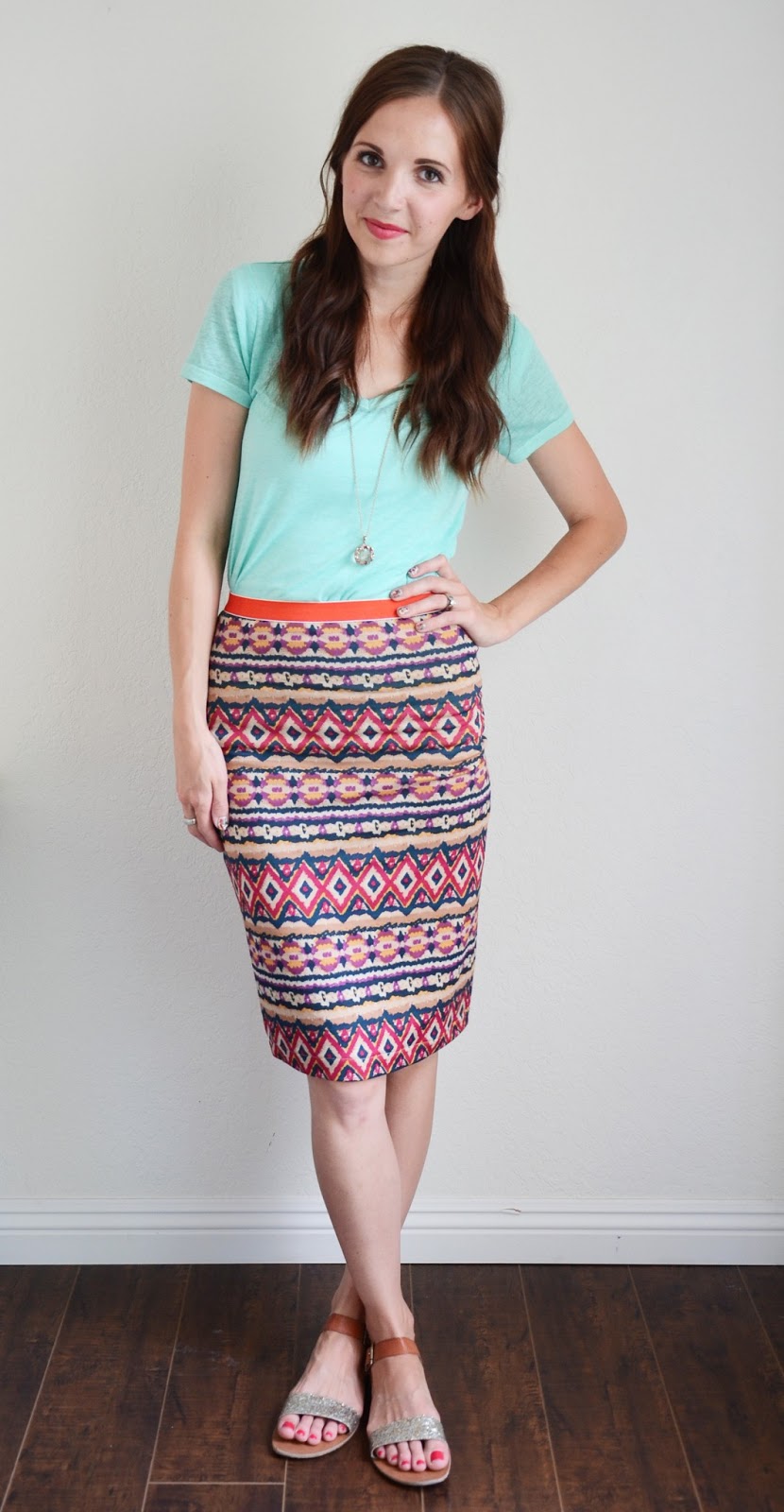 4. This skirt might be my new favorite — it is so versatile. Here I paired it with my solid colored tee to offset the loud pattern, and also pulled it up to be a high waisted knee-length skirt. I added a little lip color to match the orange and pink tones in the skirt, and a simple pendant necklace that completes but doesn’t clutter up the outfit.