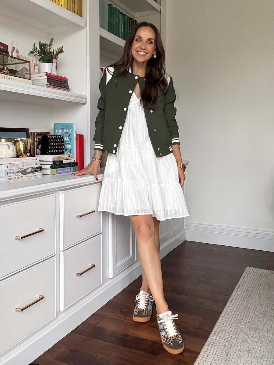 OUTFIT 4: WHITE NORDSTROM DRESS | SIMILAR VARSITY JACKET | GOLA SNEAKERS
