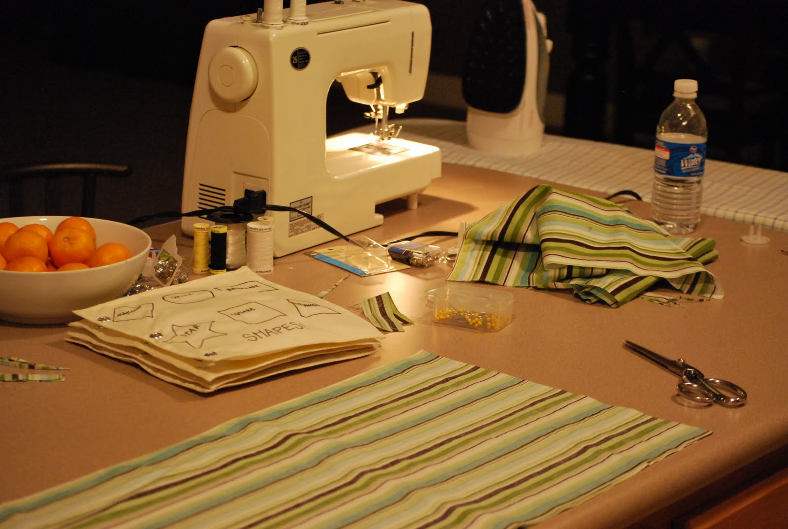 I started working on a quiet book for Peanut about six months ago, and then after working on it for about 2 days, I put it away and promptly forgot about it. Then a few weeks ago I brought it back out and started working on it here and there. With both sets of grandparents in town this weekend, we’re having a little family birthday celebration for Peanut, and Philip made me promise to finish it in time for that. So for the last three days my kitchen island has looked like this as I’ve scrambled to finish this thing. I’m almost done.